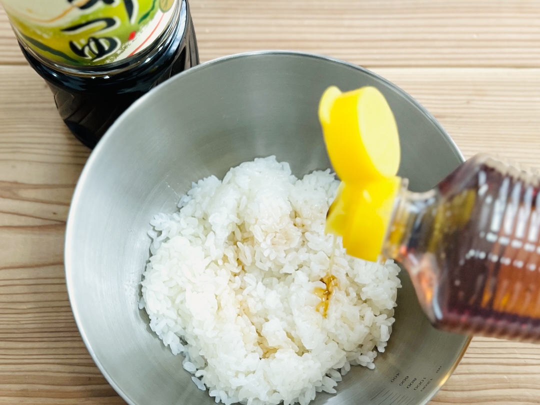 ボウルに温かいごはんを入れ、めんつゆとごま油をチョロッとかけてかき混ぜます。