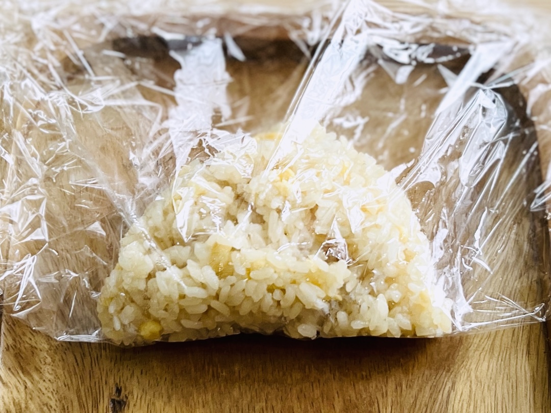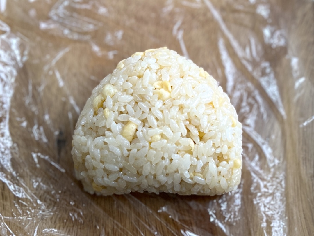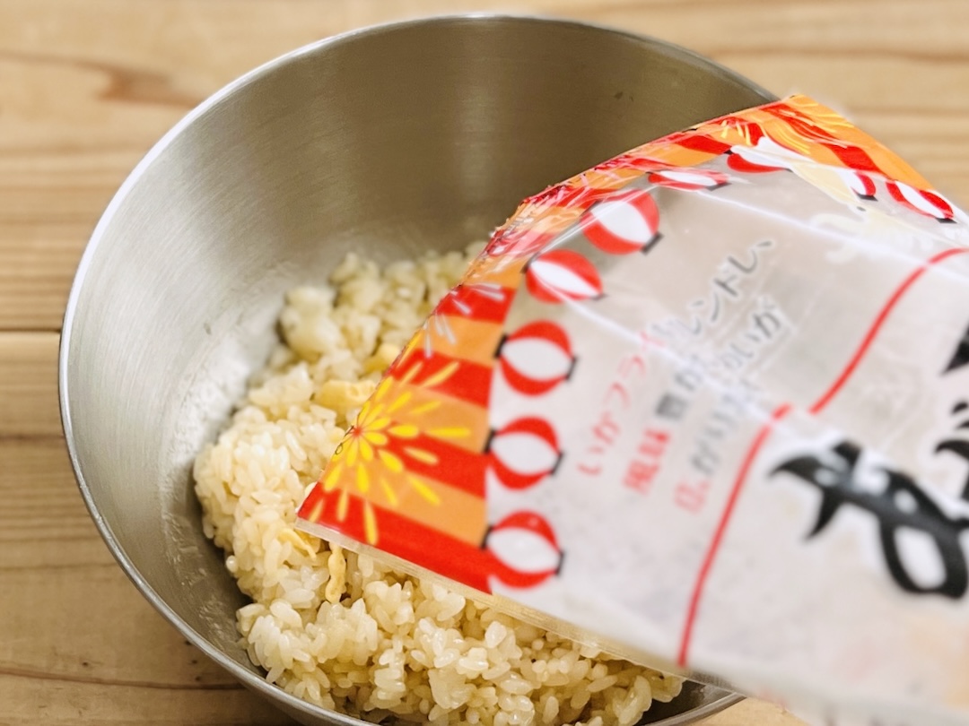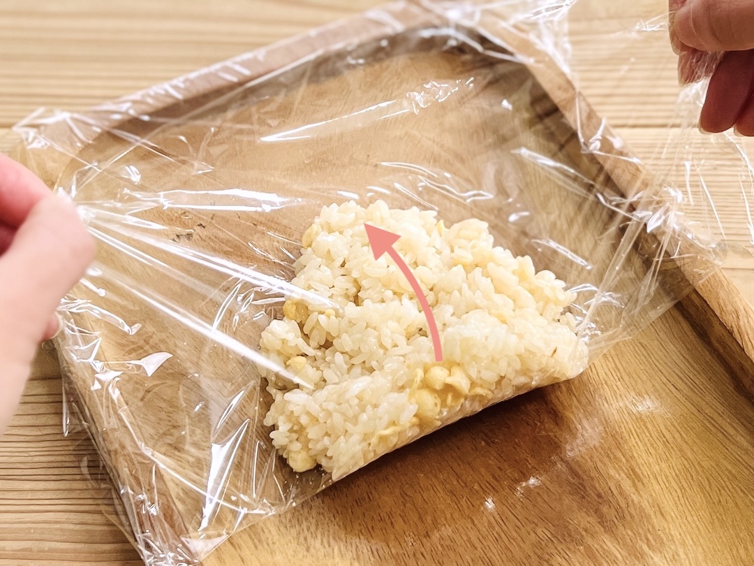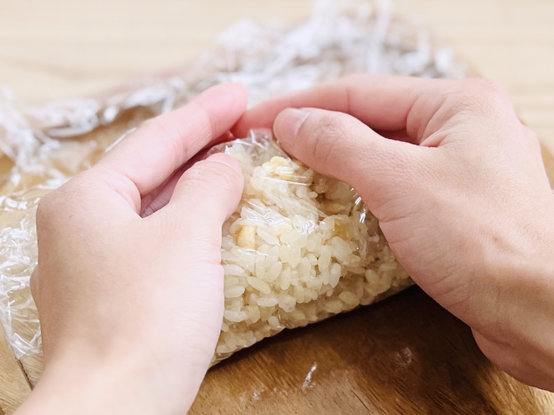 味付けに使うのはめんつゆとごま油。天かすを混ぜたごはんをラップに広げ、パタンと畳むだけで完成します。握らないので、忙しい朝でも楽勝です。